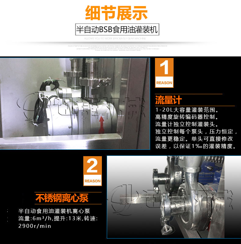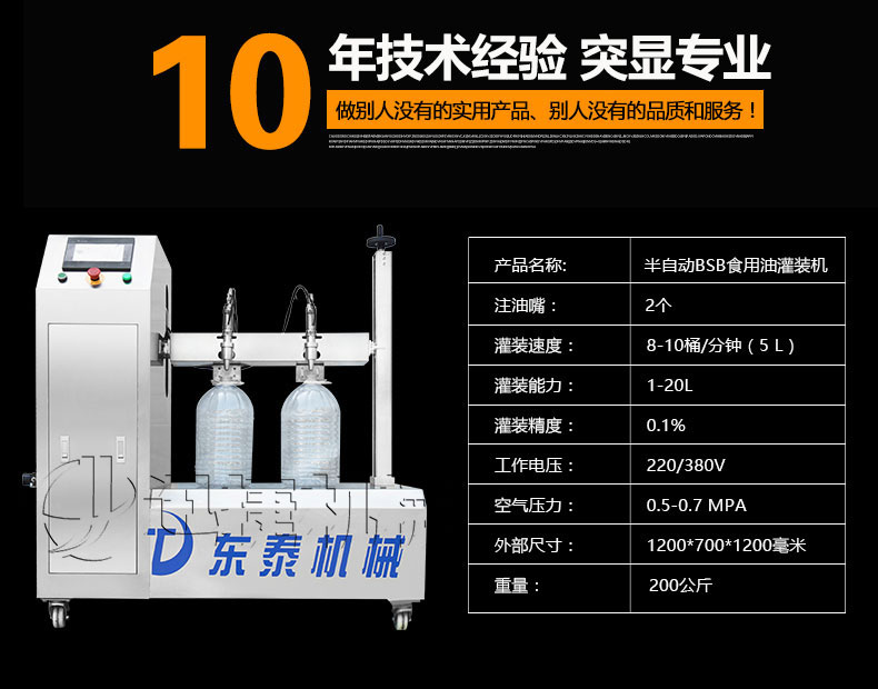 本機適用于花生油、大豆油、菜籽油、色拉油、芝麻油、石油化工潤滑油等各種油類和粘稠液體的定量要求。半自動雙頭電動BSB食用油灌裝機:采用的微電腦技術(shù),自備動力,管路無需加壓,節(jié)約運行成本;自動檢測油浙、自動修正溫度變化引起的密度變化,適合大溫差環(huán)境的油品灌裝工作,使用方便靈活;機電一體化設(shè)計,安裝方便,整機價格低廉。