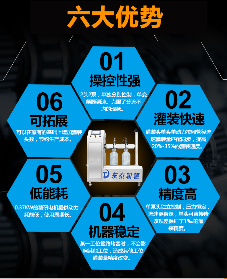 裝范圍廣、速度快、精度高—–1-20L大容量灌裝范圍,單頭單泵單變頻控制,灌裝速度快,壓力恒定,流量穩(wěn)定,單頭可直接修改誤差,保證了千分之一的精度