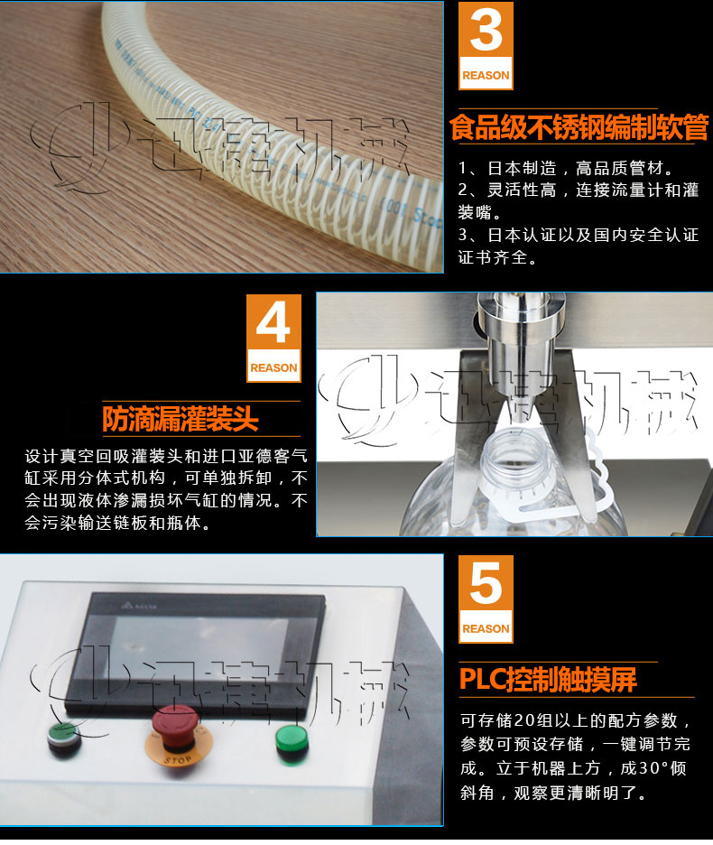 3.灌裝頭設(shè)計及真空回吸系統(tǒng),確保現(xiàn)場及包裝成品免受殘液污染,先快后慢;