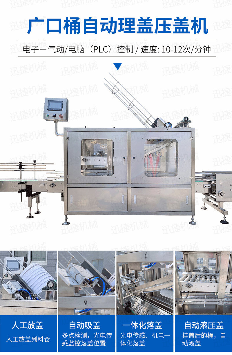 人工放蓋至料倉——自動剝離——自動吸蓋——自動掛蓋——自動滾壓蓋——自動出桶——一個循環(huán)完成。